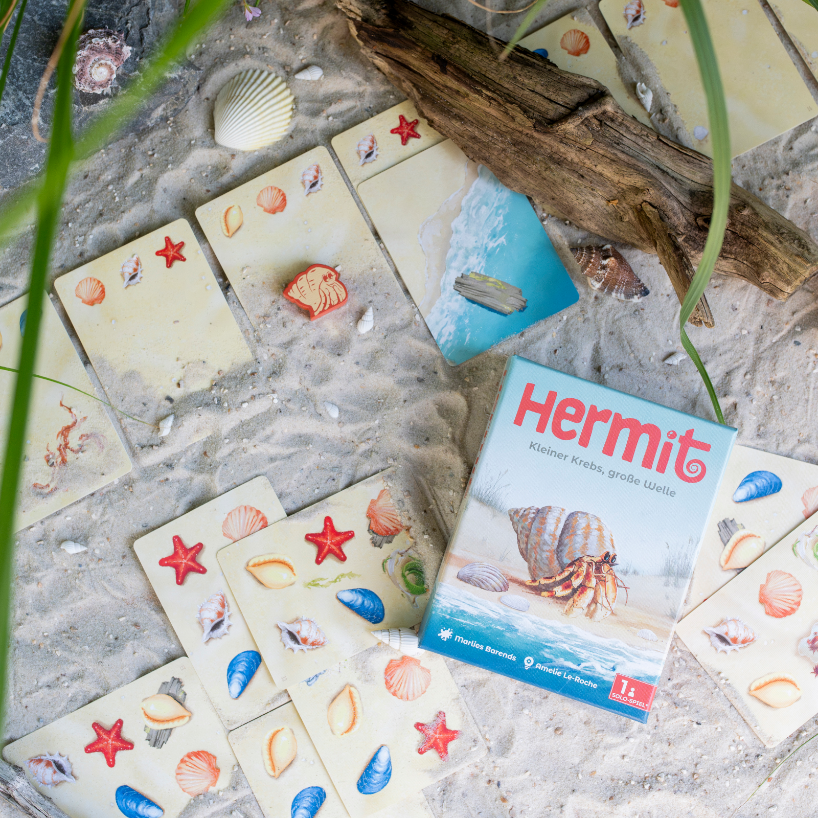 Hermit ist unser knobeliges Legespiel in handlicher Schachtel für ein oder zwei Personen ab zehn Jahren. Einer Partie dauert knapp 20 Minuten. Hermit ist jetzt solo, zu zweit im Duell oder im Koop-Modus, wenn jede mitspielende Person ein Exemplar besitzt, spielbar. Außerdem enthält die Spielanleitung 8 unterschiedliche Aufgaben, die für noch mehr Abwechslung sorgen.